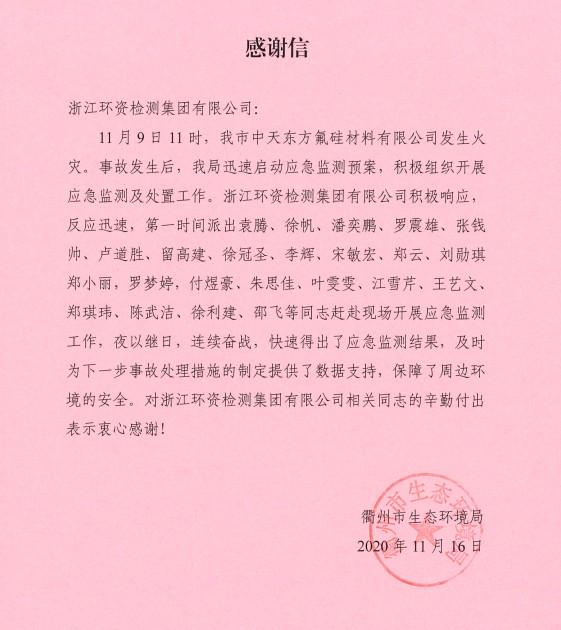 近日,浙江環(huán)資檢測集團(tuán)有限公司收到來自衢州市生態(tài)環(huán)境局的《感謝信》,感謝環(huán)資檢測集團(tuán)在11月9日本市中天東方氟硅材料有限公司發(fā)生火災(zāi)衢州市生態(tài)環(huán)境局啟動(dòng)的應(yīng)急預(yù)案中,積極響應(yīng),快速反應(yīng),抽派23名精干人員夜以繼日,連續(xù)奮戰(zhàn)3天3夜,快速提供應(yīng)急監(jiān)測結(jié)果,及時(shí)為事故處理措施提供數(shù)據(jù)支持,保障周邊環(huán)境安全。對(duì)環(huán)資檢測集團(tuán)相關(guān)人員辛勤的付出表示衷心感謝!